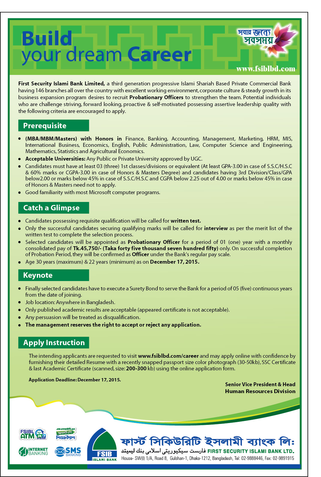 ফার্স্ট সিকিউরিটি ইসলামী ব্যাংক লিমিটেড প্রবেশনারি আফিসার পদে নিয়োগ বিজ্ঞপ্তি প্রকাশ করেছে। আবেদনকারীকে অবশ্যই শিক্ষাজীবনে ন্যূনতম তিনটি প্রথম শ্রেণী থাকতে হবে। এ ছাড়া মাইক্রোসফট কম্পিউটার প্রোগ্রামে দক্ষ হতে হবে প্রার্থীকে। ১৭ ডিসেম্বর -২০১৫ তারিখ অনুযায়ী আবেদনের বয়সসীমা ২২ থেকে ৩০ বছর।